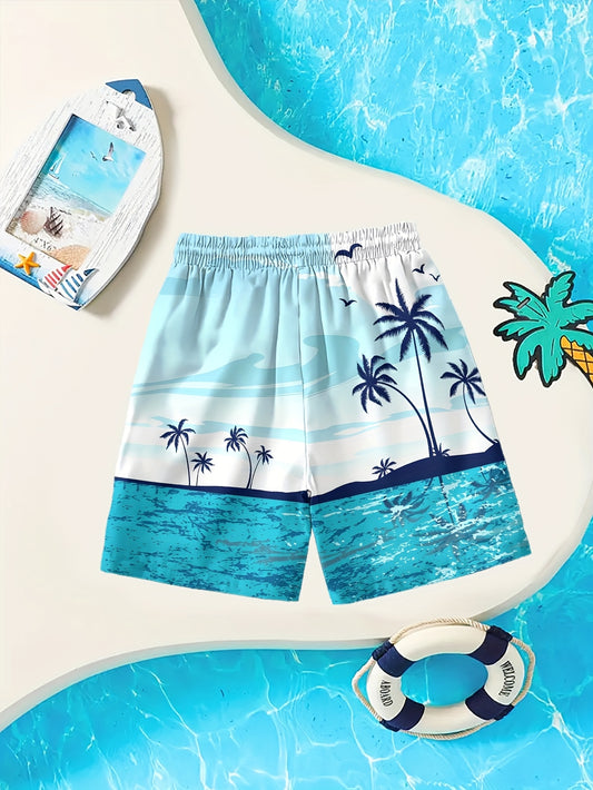 Տղաների արևադարձային լողափնյա նախշերով լողազգեստի շորտեր՝ արագ չորացող, շնչող պոլիեսթերից՝ առաձգական գոտկատեղով և լարով, բաց կապույտ արմավենու նախշերով՝ ամառային զվարճանքի և սերֆինգի համար, լողափնյա շորտեր, արագ չորացող գործվածք, բացօթյա օգտագործման համար