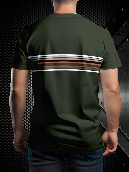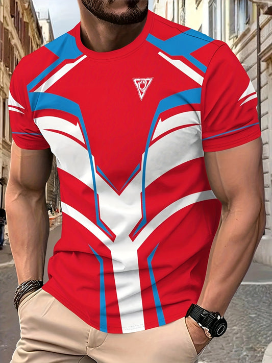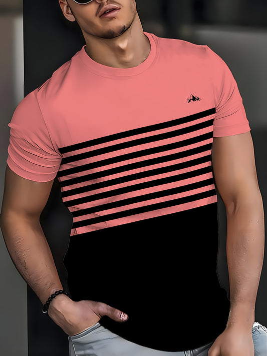 Տղամարդու ոճային վերնաշապիկ, կարճ թևքերով մարզաշապիկ՝ վառ 3D տպագրությամբ գծավոր պատչվորքով և կլոր վզնոցով, կատարյալ է ամառային փողոցային նորաձևության և առօրյա սպորտային հագուստի համար։