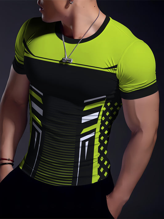 1 հատ տղամարդու մարզական մարզաշապիկ՝ պոլիեսթերից, կլոր վզով, թեթևակի ձգվող, նախշավոր տրիկոտաժե գործվածքով, ամառային ամենօրյա վերնաշապիկ՝ ֆիթնես մարզումների համար