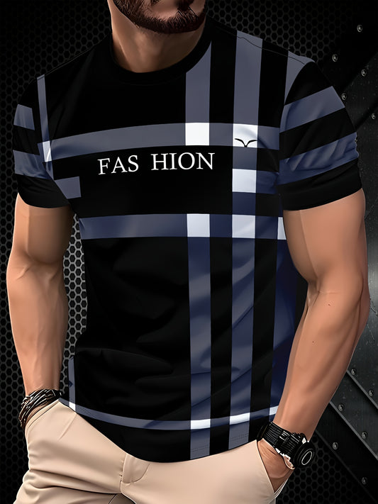 Տղամարդու առօրյա «FAS HION» գրաֆիկական շապիկ՝ սև, կապույտ, կարճ թևքերով, կլոր վզնոցով, բոլոր եղանակներին հարմար, առօրյա հագուստի համար նախատեսված, շոտլանդական նախշերով վերնաշապիկ՝ հարմարավետ չափսերով։