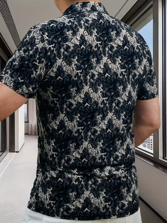 Տղամարդու նորաձև շապիկ - սև, կապտականաչավուն գույնի նախշերով, կարճ թևքերով, կանոնավոր չափսերով, պոլիեսթերային գործվածքով, իդեալական է առօրյա հագուստի համար, նորաձև շապիկ