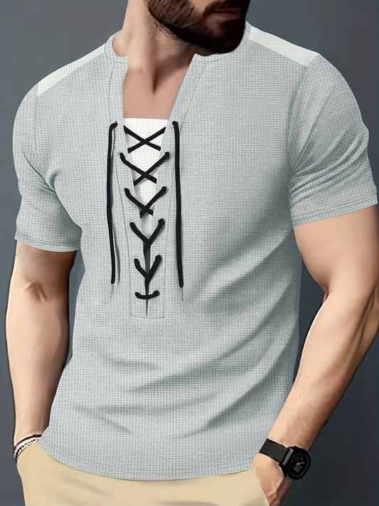 Pearson OBM առօրյա, ոճային վաֆլի նախշերով արտաքին տեսքի շապիկ, տղամարդու կարճ թևքով Y-ձև օձիքով շապիկ։