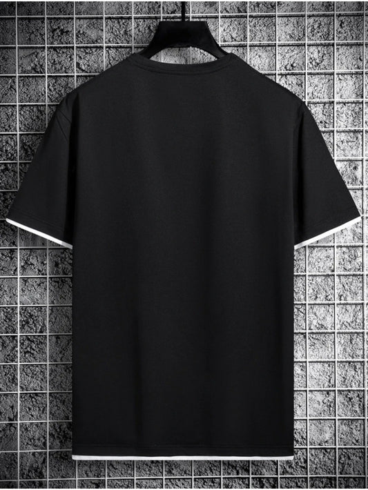 Տղամարդու սև, առօրյա, գունային բլոկներով նախշերով մարզաշապիկ - շնչող, ամառային կարճ թևքերով, ազատ չափսերով, կլոր վզնոցով, իդեալական է առօրյա հագուստի համար, հարմարավետ, գունային բլոկներով մարզաշապիկ, միջին առաձգականությամբ։