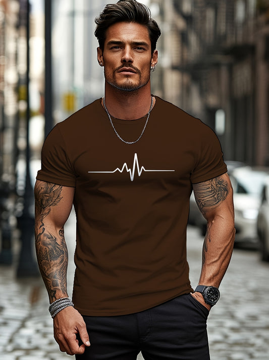 Տղամարդու շագանակագույն մարզաշապիկ՝ սրտի զարկերի գրաֆիկայով, կարճ թևքերով, կլոր վզով, ձգվող գործվածքով, բոլոր եղանակների հարմարավետությամբ, կլոր վզով մարզաշապիկ՝ հարմարավետ չափսերով