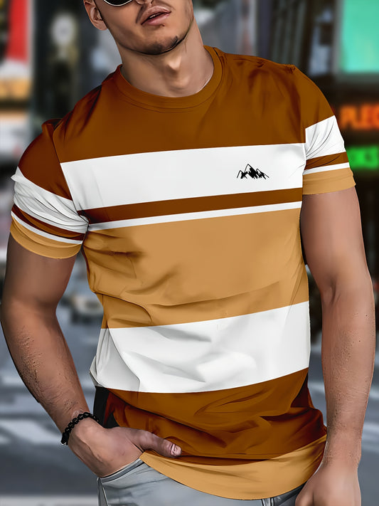 Տղամարդու ամենօրյա գծավոր շապիկ լեռան լոգոտիպով - կարճ թևքերով, կլոր վզնոցով, թեթև պոլիեսթերից, ամառային նորաձև, ամենօրյա հագուստի համար, գծավոր նախշերով, թեթև գործվածքից
