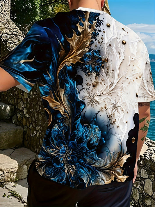 Տղամարդու կարճ թևքով, երկկողմանի թվային տպագրությամբ կարճ թևքով շապիկ՝ սպիտակ, կապույտ/ոսկեգույն ծաղկային նախշերով, շնչող, կլոր վզնոցով շապիկ, լվացքի մեքենայով լվացվող, սովորական չափսի, փողոցային ոճով, համարձակ նախշերով, թեթև շապիկ։