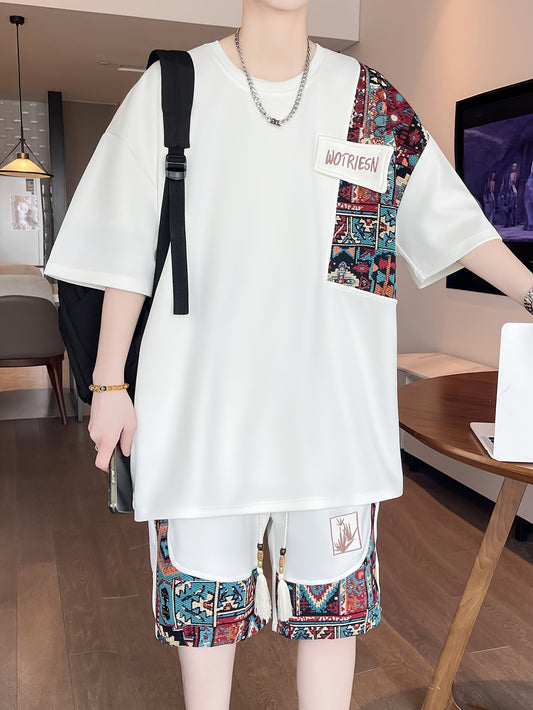 2 հատ տղամարդու ամառային առօրյա բացօթյա հավաքածու, նորաձև էթնիկ ոճի կլոր վզնոցով կարճ թևքով շապիկ և կարճ տաբատ՝ ասեղնագործության դիզայնով, ազատ չափսերով, կարճ թևքերով և լարով շորտերի համադրություն, հարմար է ամառային բացօթյա գործունեության համար։