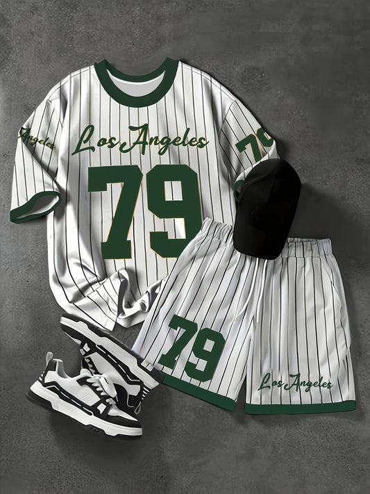 Men'S Casual T-Shirt Shorts Set - Los Angeles 79 Graphic, Green White Striped Design, Comfortable Polyester Knit for Summer Outdoor Sports, Perfect Gift for Sports Fans, Sports Fan Apparel Sporty Casual Wear Durable S