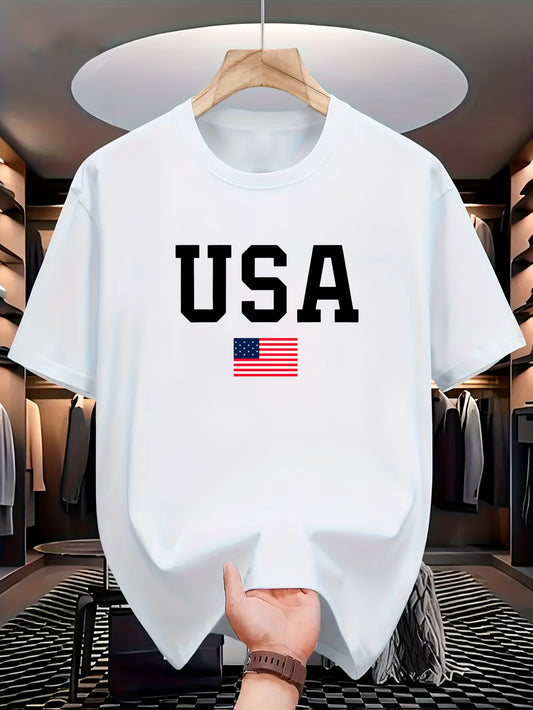USA Flag Print Crew պարանոցի վերնաշապիկ, սովորական պոլիեսթեր տրիկոտաժե թիկնոց, թեթև ձգվող, այբուբենի ձևանմուշ, տրիկոտաժե դետալ, տղամարդկանց համար, ամառային կարճաթև շապիկ