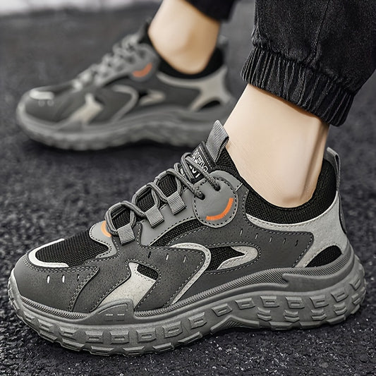 Տղամարդկանց նորաձև, հաստ սպորտային կոշիկներ՝ շնչող ցանցե PU վերին մասով, դիմացկուն PVC ներբանով, կապիչներով ամենօրյա սպորտային կոշիկներ՝ մոխրագույն, սև նարնջագույն գույներով, բոլոր եղանակների հարմարավետություն ամենօրյա հագուստի համար։