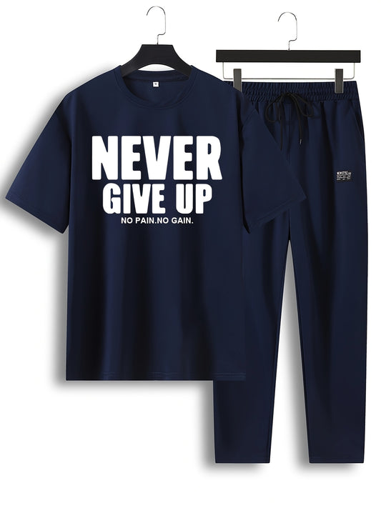 Տղամարդու 2 հատ ամառային «Երբեք մի հանձնվիր» մարզաշապիկի և վազքի հավաքածու՝ մուգ կապույտ՝ ոգեշնչող մեջբերումով, լարով գոտկատեղի համար և գրպաններով՝ իդեալական է առօրյա զբոսանքների և սպորտի համար, վազքի տաբատ