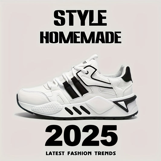 Men'S 2025 Spring Sneakers - Low-Top Lace-Up Casual Shoes with Rotating Button Closure, Breathable Mesh Lining Cushioned EVA Sole for Running, Hiking, Gym - White Black Design, Hiking Footwear, Modern Sneakers, Fabric Lin