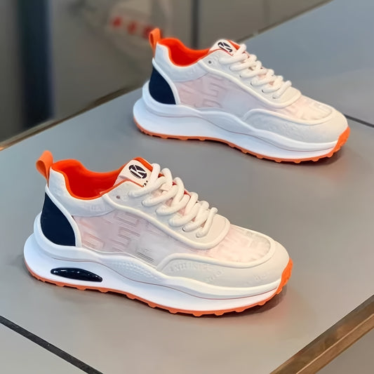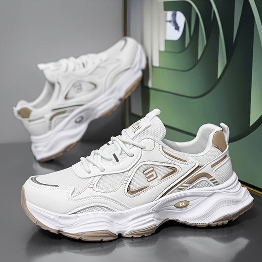 Men'S Breathable Mesh Faux Low-Top Sneakers - Lightweight Cushioned Air Cushioning, White Golden Accents, Lace-Up Casual Shoes for Running, Hiking, Gym Casual Attire, Gym Shoes, Modern Sneakers, Fabric Lined Interior
