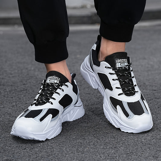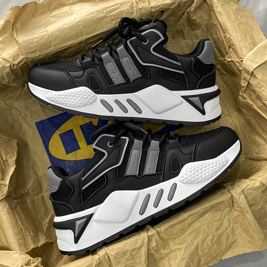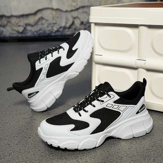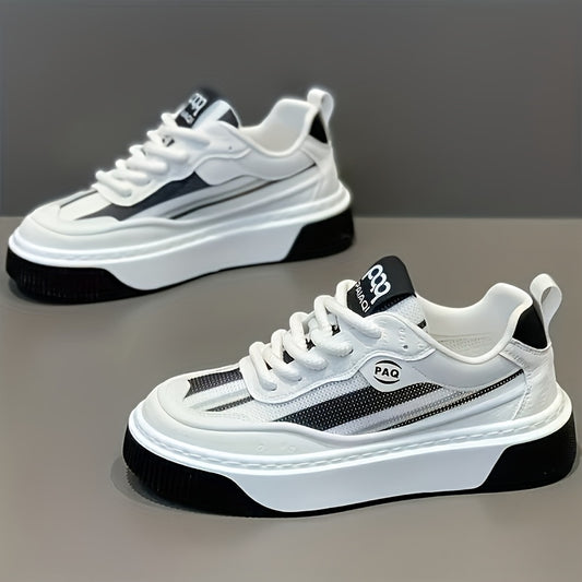 Men's Sneakers - Thick Platform Cushioned Sole, Lace-Up Closure, PU Upper Non-Slip PVC Outsole - All-Season Gym, Casual, Everyday Sneakers - Black/White Colorway - Affordable Men's Footwear, Casual Walking, Trendy Kicks, Co