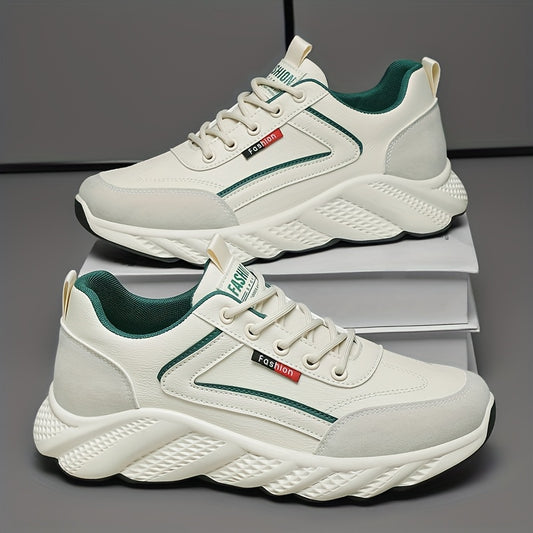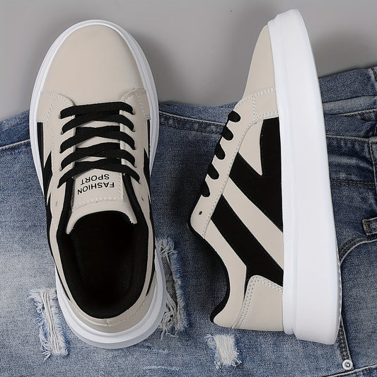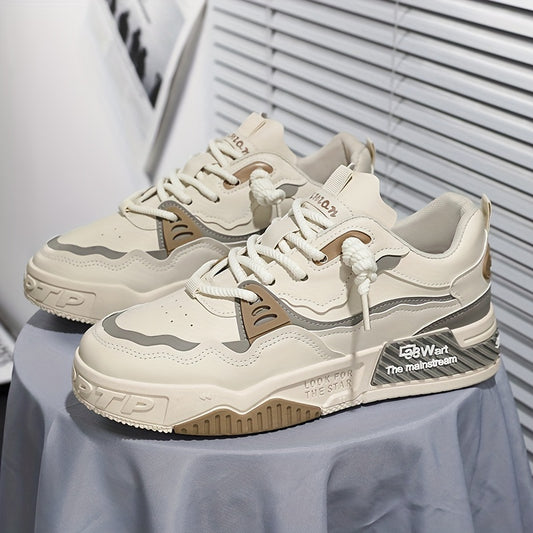 Men's Low-Top Skate Sneakers - White/Black Accent Lace-Up Shoes, Cushioned EVA Insole Non-Slip Rubber Outsole for All-Season Urban Streetwear, Gym, Everyday - Breathable PU Upper Casual Shoes, Gym Footwear, Street Style, Du