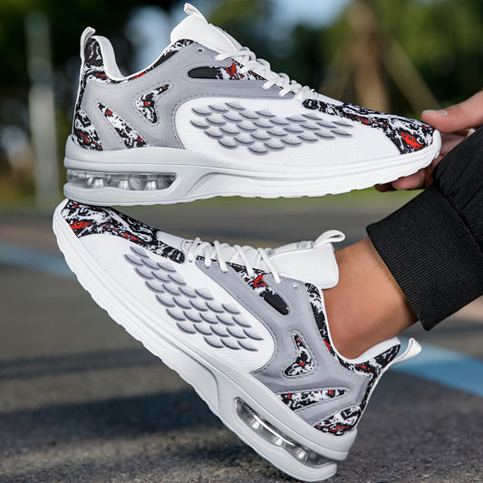 Men's Lightweight Breathable Low-Top Sneakers - PU Upper PVC Sole, White/Navy/Red Accents, Lace-Up Round Toe for Casual, Outdoor, Running Gym - All-Season Comfort Shoes, Casual Footwear, Geometric Pattern, Comfortable Fit