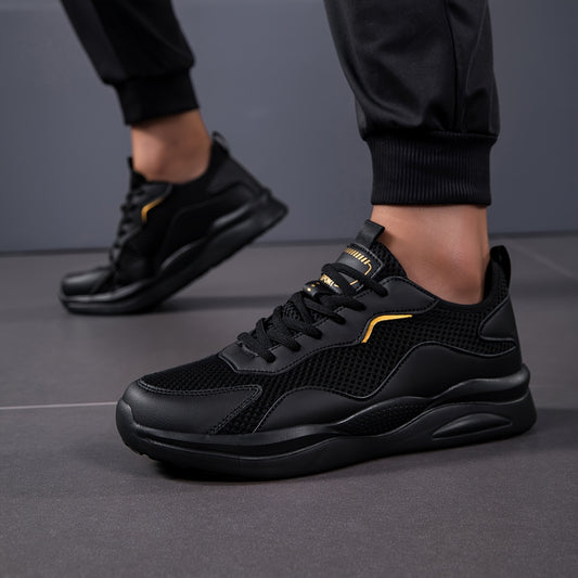Men's 2025 New Summer Breathable Running Shoes - Lightweight Cushioned Sneakers with Golden Accents, Low-Top Black Casual Shoes for Gym, Walking Daily Wear, All-Season Comfort, Sleek Sporty Design, Durable Traction Footwear