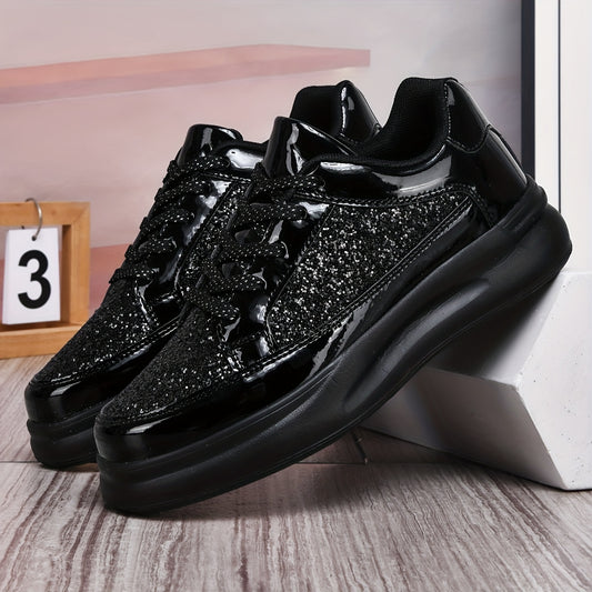 Տղամարդկանց ցածր, առօրյա սպորտային կոշիկներ՝ սև փայլուն զարդարանքներով, շնչող PU վերին մասից պատրաստված EVA փափուկ ներբանով, կապիչներով հարմարավետ քայլքի կոշիկներ տղամարդկանց և կանանց համար, հարմարավետ կոշիկներ, նրբագեղ դիզայնով ճկուն կոշիկներ