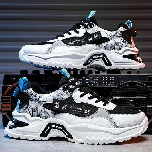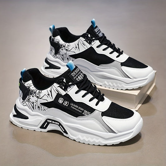 Տղամարդկանց նորաձև սպորտային կոշիկներ՝ վինտաժային պրեպի ոճով, մուլտֆիլմային նախշերով, կապած վազքի կոշիկներ, հարմարավետ, չսահող, շնչող, ամենօրյա, ցածր գագաթով, PU քայլքի կոշիկներ՝ գործվածքային ներքին PVC ներբանով, բոլոր եղանակների համար։