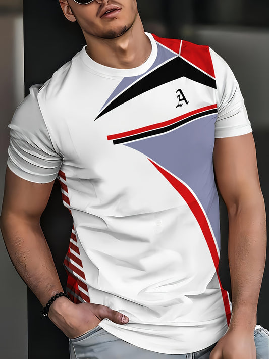 Տղամարդու սև 3D երկրաչափական նախշերով մարզաշապիկ – Կարճ թևքերով ամառային մարզաշապիկ կարմիր-մոխրագույն նախշերով, կլոր վզնոցով, լվացվող մեքենայով՝ բացօթյա սպորտաձևերի համար, ամենօրյա հարմարավետություն, դիմացկուն գործվածք