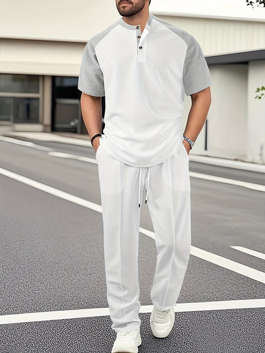 2 հատ տղամարդու ամառային առօրյա բացօթյա հավաքածու, նորաձև էթնիկ ոճի կլոր վզնոցով կարճ թևքով շապիկ և կարճ տաբատ՝ ասեղնագործության դիզայնով, ազատ չափսերով, կարճ թևքերով և լարով շորտերի համադրություն, հարմար է ամառային բացօթյա գործունեության համար։