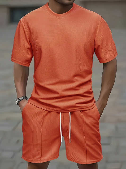 Եվրոպական և ամերիկյան ոճի տղամարդու հիմնական միագույն հավաքածու՝ կլոր վզնոցով, կարճ թևքերով մարզաշապիկ + շորտեր՝ երկու կտորից բաղկացած կոստյում