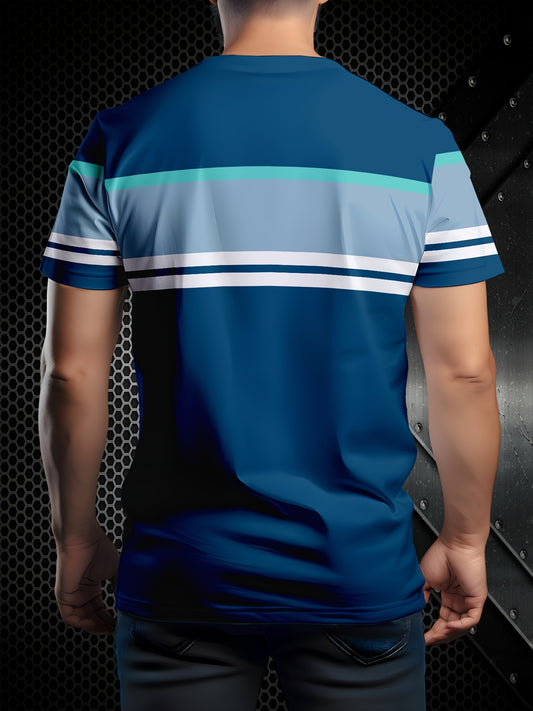 Տղամարդու ոճային վերնաշապիկ, կարճ թևքերով մարզաշապիկ՝ վառ 3D տպագրությամբ գծավոր պատչվորքով և կլոր վզնոցով, կատարյալ է ամառային փողոցային նորաձևության և առօրյա սպորտային հագուստի համար։