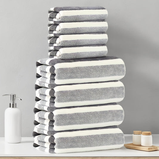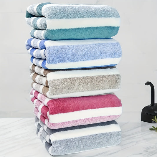 Լոգանքի 5 լայն գծավոր մեծ սրբիչների հավաքածու՝ պատրաստված Warp Knitting տեխնոլոգիայով, որը պարունակում է Coral Fleece և ծայրահեղ նուրբ մանրաթելային նյութ՝ բացառիկ կլանման, արագ չորացման և փափուկ, մաշկին հաճելի զգացողություն ապահովելու համար: