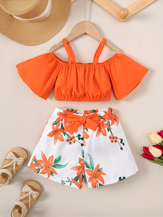 Աղջիկների շորտեր Երկկտորանոց հավաքածու Ամառային պատահական արձակուրդային ոճ Ռոմանտիկ ծաղկային տպագրության շորտեր Աղջիկների ամառային թույն շորտեր վերև + սպիտակ տպագրությամբ շորտեր Երկու կտորից