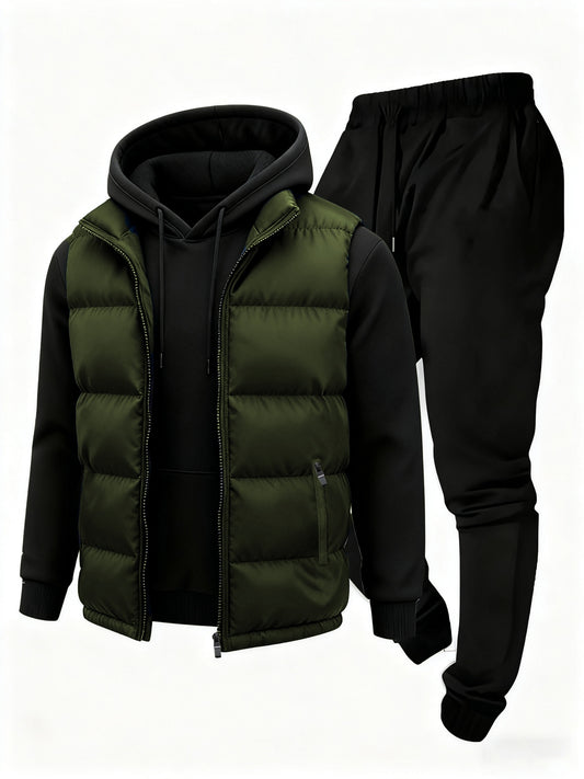 Տղամարդու գունային համադրություն՝ կայծակաճարմանդով և գլխարկով բաճկոնով և տաք սպորտային հագուստով, հարմար է աշնանը և ձմռանը առօրյա, մարզական և բացօթյա գործունեության համար: Կտորը փափուկ է, հարմարավետ, տաք և բարձր առաձգական: