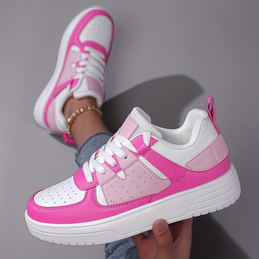 Կանացի թեթև շնչող, պատահական սպորտային կոշիկներ - ցածր վերևի ժանյակավոր սքեյթ կոշիկներ՝ չսահող փափուկ տակացով, վարդագույն և սպիտակ դիզայնով, հարմարավետ հագուստ բոլոր սեզոններում