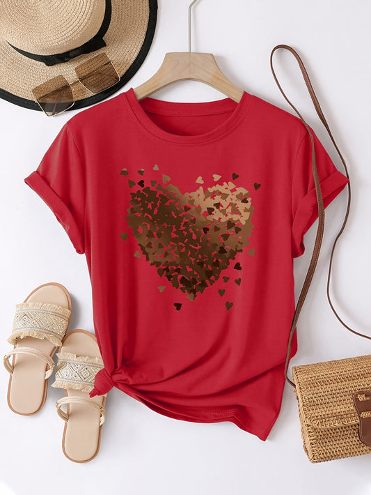 Նորաոճ շագանակագույն գրադիենտ սրտային պրինտ շապիկ - 100% պոլիեսթեր, կլոր պարանոց, կարճ թեւ, սպորտային թիկնոց կանանց համար - լվացվող մեքենայում, կատարյալ գարուն/ամառ նորաձևության համար