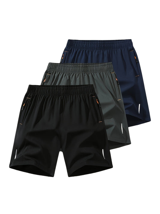 Տղամարդկանց նորաձև սպորտային պատահական շորտեր 3 փաթեթով, 97% պոլիեսթեր 3% էլաստան, պինդ գույն, կայծակաճարմանդ դետալ, հյուսված գործվածք, թեթև ձգվող, ազատ տեղավորվում է, 117 գ/մ² քաշ