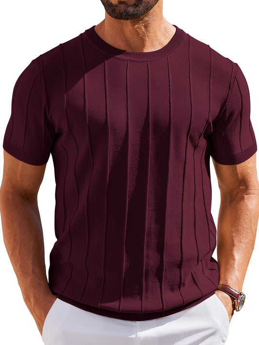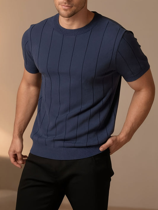 Տղամարդու նեղ, ուղղահայաց շերտավոր, կլոր վզնոցով, կարճ թևքերով տրիկոտաժե շապիկ | Շնչող, մաշկին հարմար գործվածք, իդեալական է ինչպես առօրյա, այնպես էլ գործնական առիթների համար, բազմակողմանի շերտավոր հագուստի համար