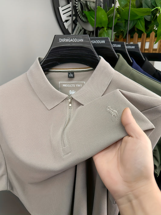 [T-Shirt] Men's Summer Casual Short Sleeve T-Shirt - Breathable Mesh Crew Neck Henley Style Zip Placket, Breathable Fabric, Dry Cleanable Regular Fit Outdoor & Casual Attire, Loose Style, Zip Front Design, Easy Care, Zip Shir