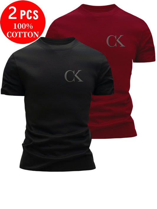 2 հատ 100% բամբակյա տղամարդու մարզաշապիկներ, ամառային կարճ թևքերով, նեղ չափսի վերնաշապիկներ, նորաձև, բազմակողմանի, առօրյա, հիմնական ոճի, կրծքավանդակին մինիմալիստական CK տառի տպագրությամբ՝ շքեղության համար։