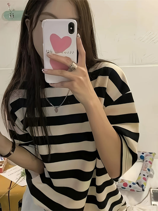 Կանացի դասական սև-սպիտակ գծավոր մարզաշապիկ՝ ամառային առօրյա կարճ թևքերով, գերազանց չափսերով և կլոր դեկոլտեով, լվացքի մեքենայով լվացվող պոլիեսթերի խառնուրդով, բոլոր եղանակների համար նախատեսված վերնաշապիկ | Ազատ չափսերով վերնաշապիկ | Ձգվող գործվածք