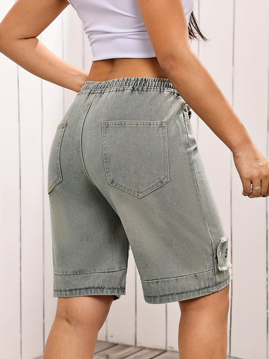 Relaxed Style| Women's Light Blue Faux Denim Casual Shorts - High-Waisted, Loose Fit with Drawstring, Summer Wash-Free Polyester Shorts for Everyday Comfort, Summer Casual Wear|Drawstring Shorts|No Stretch Fabric, High Waiste