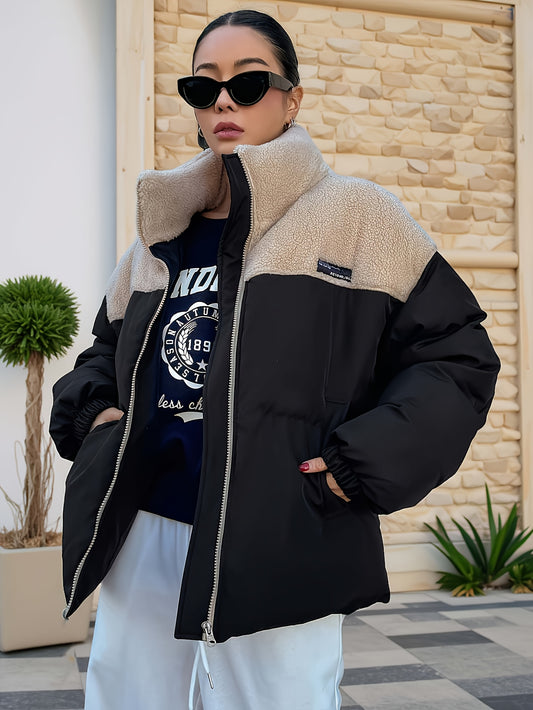 Women's Oversized Winter Coat with Teddy Jacket & Full-Zip Front - Black/Brown Color Block Jacket, Thick Pockets, Machine Washable Cold Weather Outerwear (Casual to Formal) - No Belt Required, Winter Jacket For Women, Jackets