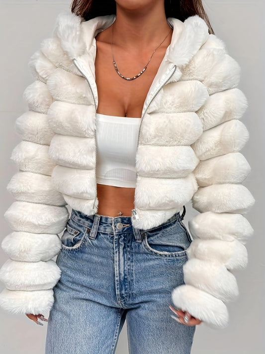 Women'S Elegant Faux Fur-Lined Hooded Jacket - Chic Short Coat with Zipper Closure, Long Sleeves, Solid Color & Striped Design for Fall/Winter, Cozy Warm Outerwear for Casual or Formal Occasions, Ladies Winter Coats, Seasonal