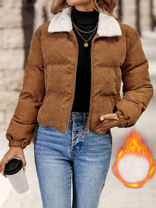 Էլեգանտ պոլիեսթերային բարձիկով կանացի բաճկոն - 2024 թվականի նորաձև կարճ միագույն վերարկու՝ հաստ արհեստական մորթուց օձիքով, երկար թևքերով, կայծակաճարմանդով, գործված - Ձմեռային ջերմություն, առօրյա վերնազգեստ