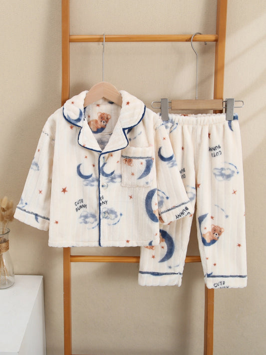 2025 թվականի աշնանային և ձմեռային նոր տղաների տնային հագուստի երկկտոր մանկական գիշերանոցների հավաքածու՝ ֆլանելե հաստ թավշյա, լուսնային արջուկի նախշերով գրպանային կոճակներով, ցրտադիմացկուն ջերմային ներքնազգեստ