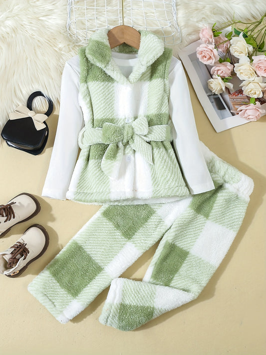 3 հատ փափուկ հավաքածու՝ աղջկա վանդակավոր թեդի բաճկոն + երկար թևքով վերնաշապիկ + թեդի տաբատ, աղջիկների համար նախատեսված ձմեռային/աշնանային հագուստ, նվեր