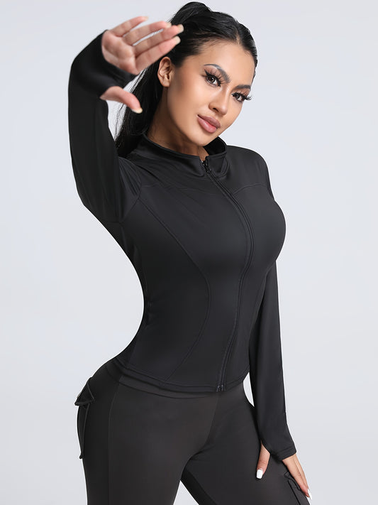 Կանացի խնամված սև սպորտային ժապկա՝ հարմարավետ ձգվող տրիկոտաժե, երկարաթև, մատնաթաթի անցքեր, լվացվող մեքենայում՝ կատարյալ ֆիթնեսի և ամենօրյա հագուստի համար