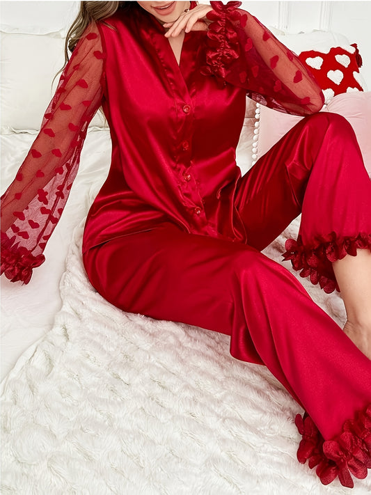 Կանացի էլեգանտ երկարաթև պիժամայի հավաքածու՝ ժանյակավոր զարդանախշերով՝ վառ կարմիր V-աձև դեկոլտեով, ծաղկային ժանյակավոր դետալներով, փափուկ պոլիեսթերային խառնուրդ՝ բոլոր եղանակների համար։