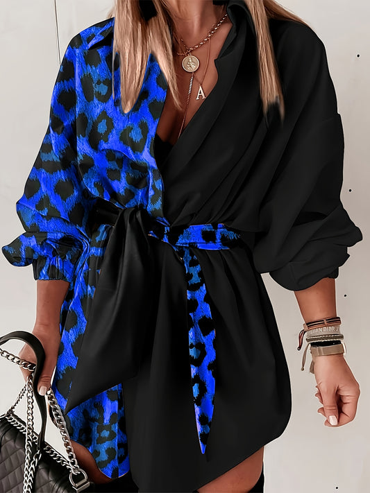 1 հատ կանացի ընձառյուծի պրինտով կապող վերնաշապիկ՝ փողկապով գոտկատեղով, V- պարանոցով պոլիեսթեր բլուզի զգեստ, ամբողջ սեզոնային հյուսված կոճակով դետալ, 100% պոլիեսթեր մեծահասակների հագուստ