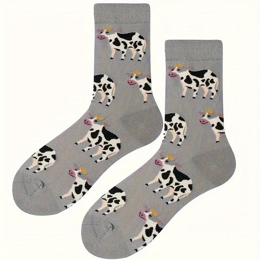 1 զույգ Unisex Couple'S ծնկների երկարությամբ գուլպաներ, մոխրագույն կովի տպում, 100% պոլիեսթեր տրիկոտաժե գործվածք, կենդանական ձևավորում, ձեռքի լվացում/քիմմաքրում