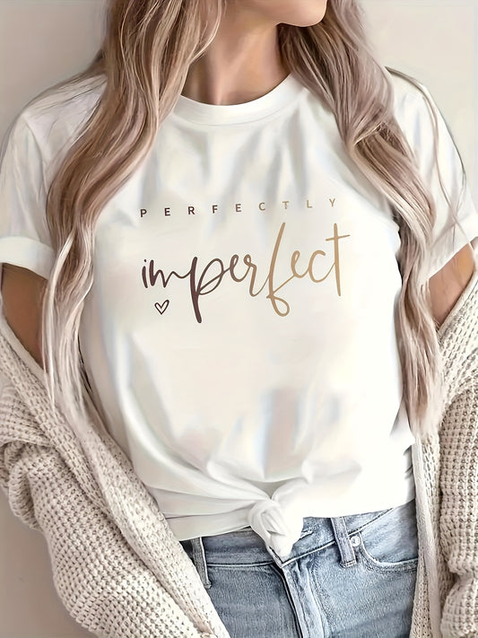 Կանացի առօրյա տառերով տպագիր շապիկ՝ «Perfectly Imperfect» դիզայնով, կլոր վզնոցով, կարճ թևքերով, փափուկ պոլիեսթերային գործվածքով, բազմակողմանի, ամենօրյա վերնաշապիկով