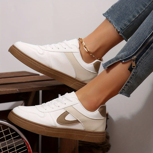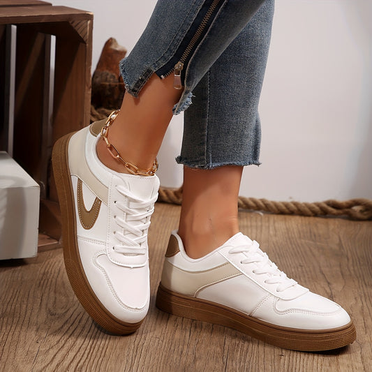 Women'S Chic White Sneakers - Stylish Low-Top Lace-Up Casual Shoes with Golden Accents, Lightweight All-Season Footwear, Waterproof, Non-Slip, Round Toe Design for Everyday, Sports, and Office Wear, Everyday Sneakers | Chic W
