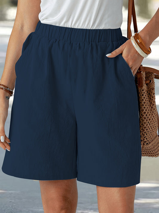 Կանացի էլեգանտ միագույն սովորական հարմարավետ շորտեր, 95% պոլիեսթեր 5% էլաստան, ամառային հյուսված գործվածք, 120 գ/մ², ազատ տեղավորվել՝ մուգ կապույտ